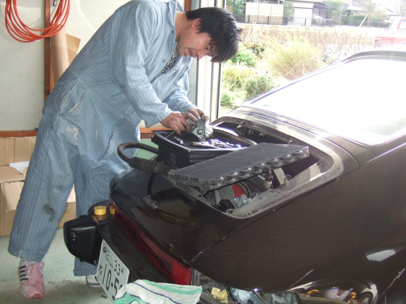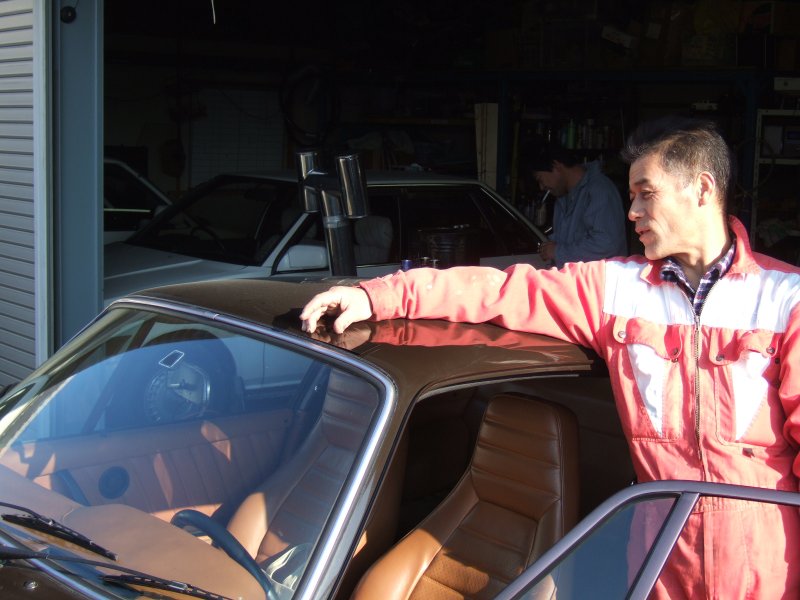 基本的には今までのボデー色と同じ色で塗り上げる予定です。 色合わせはヘンカタ氏にお願いいたしました。 テストピースを実際のボデーに乗せて具合いを確認しております。 ヘンカタ氏も真剣な顔つきになっております。 |
